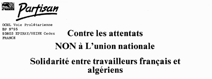 A nouveau un attentat à Paris. Par le choix de ses cibles, cet attentat comme les précédents, est d’inspiration fasciste qu’il ait été commis par des intégristes islamistes du GIA ou par d’autres. Comment qualifier autrement un acte qui tue de manière aveugle et indifférente ceux qui passent par hasard, qu’ils soient français ou étrangers ? Rien à voir avec les actions d’organisations qui prennent soin de viser une cible symbolique ou des responsables de l’Etat ou du gouvernement, bref qui s’attaquent non pas au peuple, mais à ses ennemis.