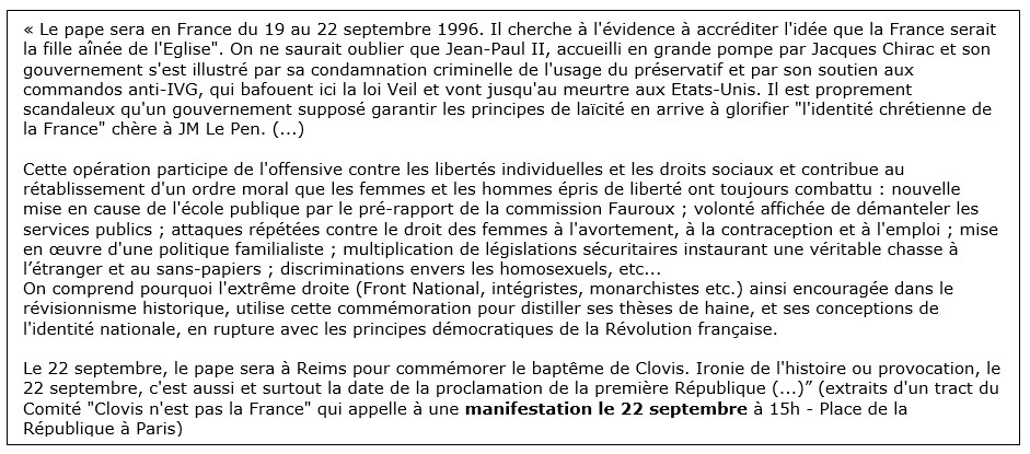 Intégrisme religieux et nationalisme sont étroitement liés, et on ne peut combattre le premier sans combattre le second. En ce sens, le collectif "Clovis n’est pas la France" qui prétend combattre l’intégrisme papal au nom d’une France républicaine est voué à l’échec.