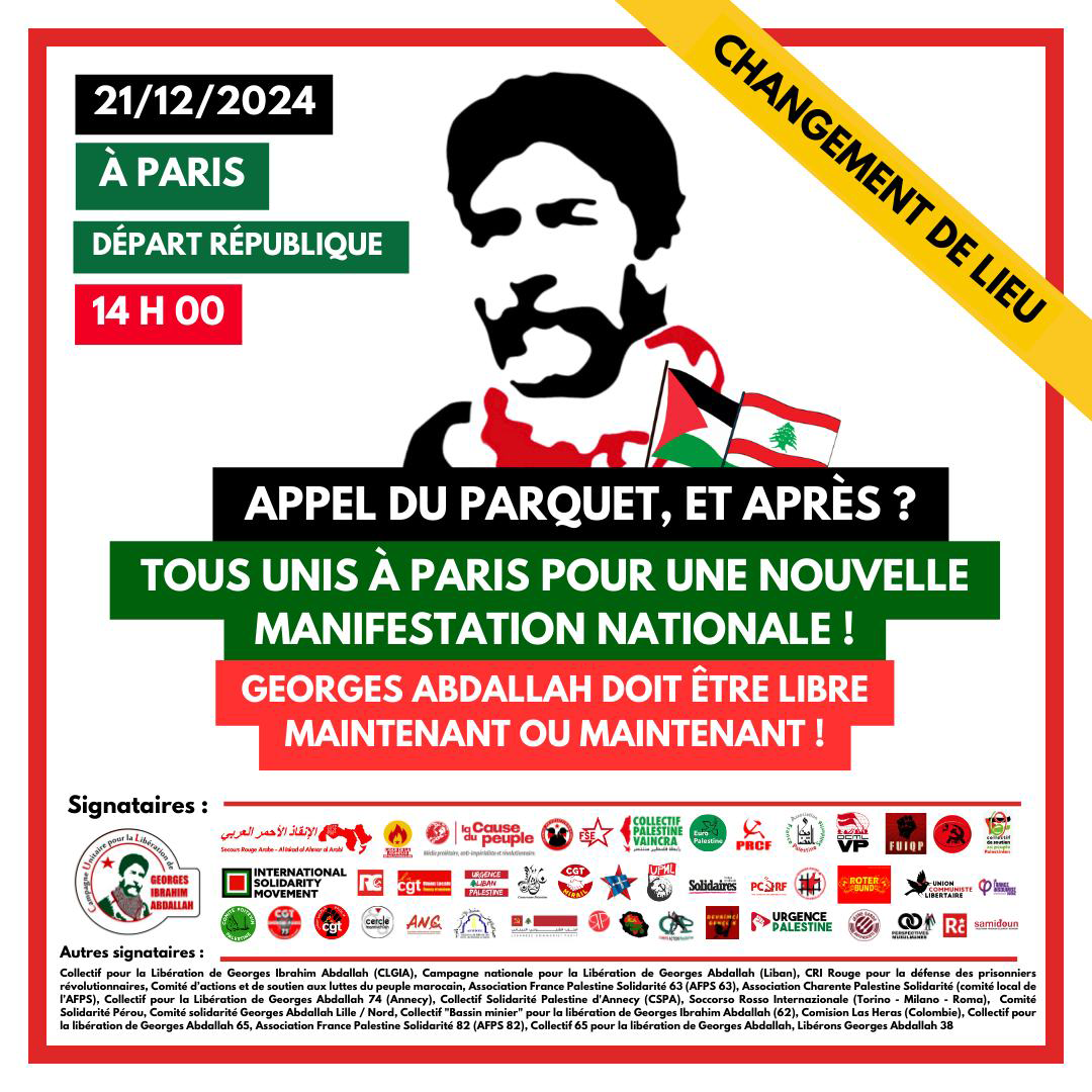 Dans ce combat final, frappons aussi d’une seule main en nous rassemblant tous lors d’une nouvelle manifestation nationale à Paris, au cœur même du pouvoir de l’Etat français, le samedi 21 décembre au cri de « Georges Abdallah, tes camarades sont là ! ». En ce sens, nous appelons tous les soutiens solidaires de France mais aussi des pays limitrophes à en être, à être massivement présents pour démontrer une nouvelle fois - et nous espérons une dernière fois - notre détermination à voir notre camarade Georges Abdallah enfin libre, pour la victoire ou la victoire !