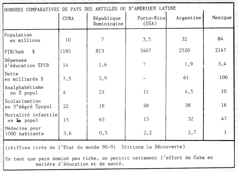 Si l’on compare la situation sociale de Cuba aux autres pays d’Amérique latine, elle apparait comme nettement la plus avancée : niveau de vie moyen, taux de mortalité infantile, accès et qualité des soins médicaux, accès et qualité de l’enseignement... sur tous ces indices, Cuba non seulement est en tête des pays d’Amérique latine, mais se rapproche ou dépasse les USA et le Canada (voir le tableau de données chiffrées). Quand on pense à l’état de misère et d’arriération du pays il y a 30 ans à la chute de la dictature de Batista, on ne peut qu’être impressionné. Les pays les plus développés d’Amérique latine, le Brésil, l’Argentine, le Mexique, le Venezuela, ont bien des équipements équivalents à ceux de Cuba. Mais ils sont réservés aux couches supérieures (bourgeoisie, petite-bourgeoisie intellectuelle). A Cuba, ils sont accessibles à tous. Dès les premières années de la révolution, une mobilisation importante a eu lieu pour alphabétiser et vacciner l’ensemble de la population. Et aujourd’hui, les médecins et les enseignants cubains sont une aide à de nombreux pays en difficulté (il y a 2000 médecins cubains à l’étranger, plus que l’Organisation Mondiale de la Santé, organisme de l’ONU !).