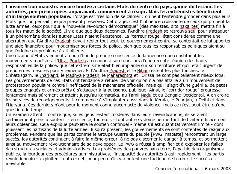 Par ailleurs, People’s War développe depuis des années un travail d’analyse et de réflexion sur la situation mondiale et la réalité politique et sociale de l’Inde qui en font une force particulièrement sérieuse et respectable, même si on n’en partage pas l’ensemble des positions.