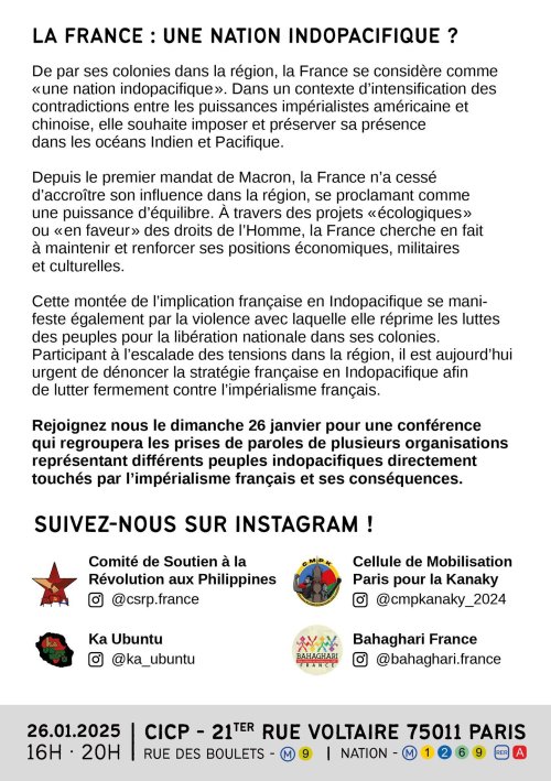 L’OCML Voie Prolétarienne s’associe à cette excellente initiative, pour dénoncer la présence de l’impérialisme français dans la région, entre Mayotte, la Réunion, la Kanaky et la Polynésie, les bases militaires navales et toute la concurrence dans le cadre de la préparation du futur conflit mondial...