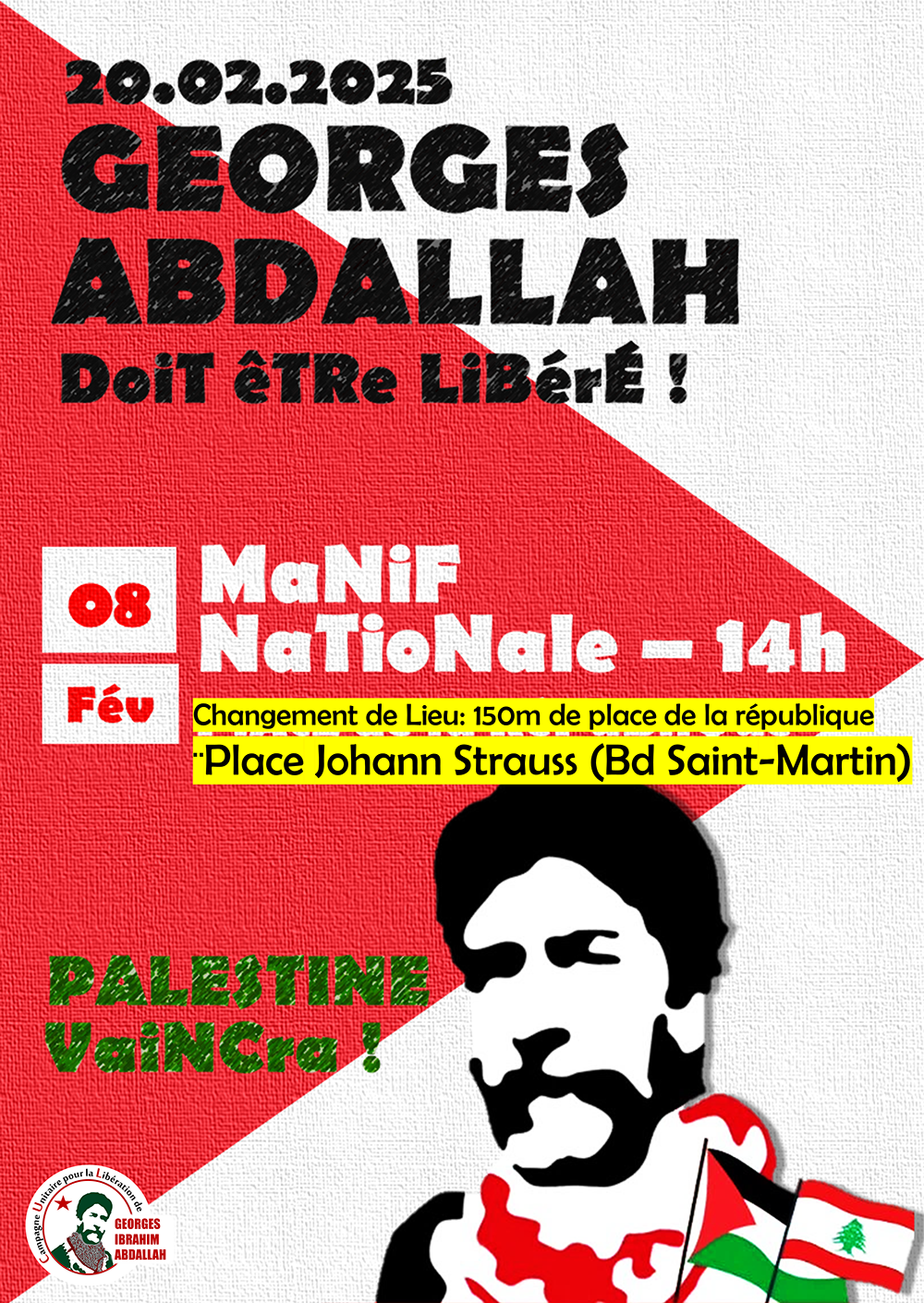 Temps est venu de vaincre, camarades, car comme le dit lui-même Georges Abdallah, nous tous soutiens du peuple palestinien et de son héroïque résistance, nous nous devons d’être « dignes de l’épopée de ces flambeaux de la liberté et faire de leur libération un devoir prioritaire » ce qui, en l’occurrence en France, se traduit inéluctablement par la libération de ce combattant historique de la cause palestinienne.