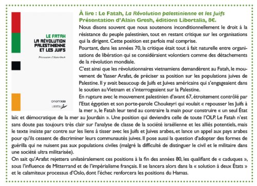Nous avons réaffirmé à cette occasion notre opposition à l’assassinat de civils désarmés, qui a longtemps été aussi la ligne générale de la résistance palestinienne, jusqu’à la création du Hamas à la fin des années 80. Nous avons réaffirmé aussi notre opposition au projet de société du Hamas, pour qui les civils font tous partie de ce qu’ils appellent « l’occupation » et qui consent seulement à regretter les morts d’enfants et de personnes âgées (au nom de la morale religieuse).