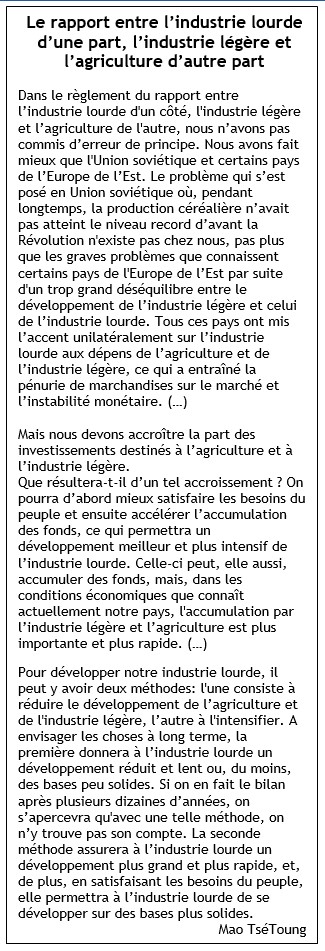 Bref le mode de développement industriel de l’Algérie est un échec total pour ce qui est de construire une économie indépendante et équilibrée. C’est, à la caricature, ce que critiquait Mao à propos de l’URSS dès 1956 (voir encadré).