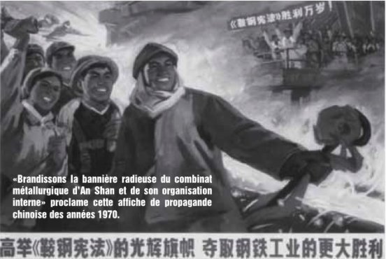 Après avoir suivi le modèle soviétique, c’est avec l’expérience du Grand Bond en Avant que Mao a commencé à critiquer ce modèle. Les masses en Chine allaient s’emparer de la Charte d’Anchan : la gestion des usines est avant tout politique, ce qui place au premier plan les objectifs politiques de l’édification du socialisme et non des objectifs étroitement économiques. Ceux qui ont des responsabilités de gestion et de direction doivent travailler à la production pendant 2 ou 3 jours par semaine, en général à un poste fixe. Le comité de parti de l’usine se réunit sous le contrôle des travailleurs. A partir de la création de groupes de gestion ouvrière et des comités révolutionnaires, s’amorce la disparition et la division entre les tâches de direction et celles d’exécution. Les activités de contrôle et de gestion sont démultipliées au travers des ateliers par ces groupes de gestion, qui élaborent les plans de production, la fixation de tâches de production, de la sécurité, des innovations et investissements... Cela a été possible par la politisation des travailleurs, la lecture des classiques du marxisme-léninisme et des œuvres de Mao. Par la reconnaissance en pratique du rôle dirigeant des travailleurs, et de l’idée que l’usine n’est pas seulement un lieu de production mais aussi une unité politique et un lieu d’intense activité idéologique.