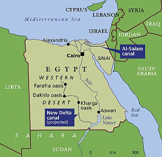 L’usage fait par le régime Moubarak des eaux du Nil est substantiellement analogue : celui-ci a décidé que les nouvelles terres arables créées par l’irrigation du Sinaï ne serviraient pas à améliorer les conditions de vie des paysans égyptiens et à produire des céréales pour la consommation intérieure, mais seront « louées », pour des périodes de 40 à 99 ans, à de gros investisseurs égyptiens et étrangers pour y produire surtout des cultures d’exportation, et, donc, des profits pour les élites au pouvoir.