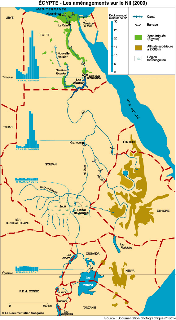 Il est vital, pour l’Egypte, de continuer à disposer amplement des eaux du Nil. En amont, dans la bassin du fleuve (long de 6 671 kilomètres) et de ses affluents, se trouvent cependant huit autres pays : Soudan, Ethiopie, Kenya, Ouganda, Congo (Rep. Dém.), Rwanda, Burundi et Tanzanie. Avec l’Egypte, ils font partie de l’Initiative du bassin du Nil, un partenariat pour la cogestion des ressources hydriques de la zone. Tâche pas facile. Selon des accords remontant à l’époque du colonialisme britannique, Egypte et Soudan auraient le droit d’utiliser 80% de l’eau. Mais les autres pays revendiquent une plus grande part et en 2010 ils ont conclu un accord qu’Egypte et Soudan se refusent à signer.