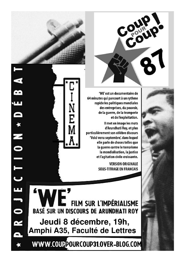 Jeudi 8 décembre, à 19h, le collectif Coup Pour Coup 87 vous invite à la projection du documentaire ’WE’. Celui-ci met en image le célèbre discours d’Arundhati Roy ’Voici venu septembre’ qu’elle a prononcé aux Etats-Unis peu après les attaques du 11 septembre. Elle y évoque notamment la guerre contre le terrorisme, la mondialisation, la justice et l’agitation civile croissante. La musique de ce qui s’apparente à un clip vidéo sert de fond sonore aux mots d’Arundhati Roy et aux images de l’humanité du monde dans lequel nous vivons tous aujourd’hui. Rendez-vous à la Faculté de Lettres et Sciences Humaines, amphi A35, le jeudi 8 décembre à 19h.