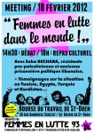 Pour 2012, l’heure est à la création de solidarités internationales dans un contexte de crise mondiale, avec son lot de conflits militaires. C’est pourquoi nous avons invité des militantes de Tunisie, kurdes, et pro-palestinienne (Soha Bechara) pour un meeting le 18 février à Saint-Ouen. Soutien financier, participation à l’organisation pratique et politique, relais de l’information, repas culturel solidaire, garde d’enfants..., il y a plein de choses à faire et nous avons besoin de vous !