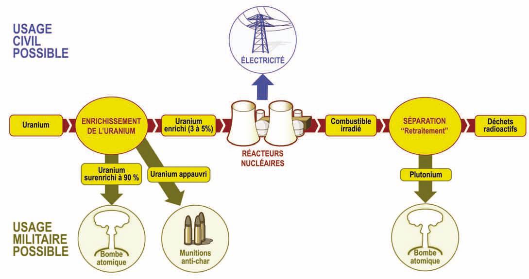 L’ancien directeur général de l’AIEA (agence internationale de l’énergie atomique, structure de l’ONU) le dit de la façon la plus limpide qui soit : « Les pays qui maîtrisent l’enrichissement de l’uranium et la séparation du plutonium deviennent de facto des États capables de se doter de l’arme atomique ». Sans doute le plus bel aveu de la totale imbrication entre l’industrie nucléaire civile et militaire.