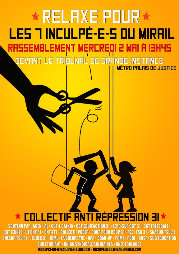Collectif anti-répression 31, soutenu par : FSE, AGEN, UNEF Toulouse, Fédération CNT Education, UL CNT 31, FERC-SUP CGT 31, CGT Educ’action 31, CGT E-Dalkia, CGT Jeunes, Coup Pour Coup 31, OCML-VP, JCML, Union Syndicale Solidaire, FSU 31, SNESUP FSU 31, SNASUB FSU 31, SUD-Etudiant, RUSF, SUD Education, NPA, AL, PCmF, CGT Freescale, La Guerre Tue, JC/UEC 31, PCOF, Collectif POOLP…