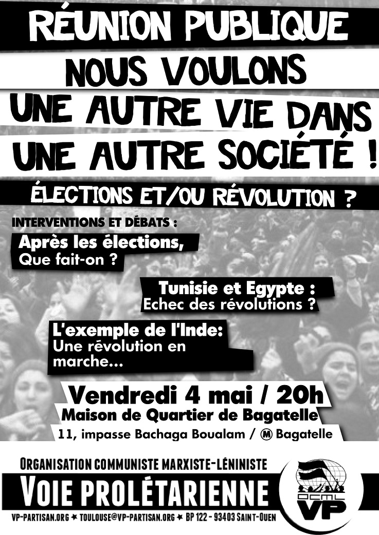L’OCML-Voie Prolétarienne de Toulouse vous invite à une réunion publique : "Nous voulons une autre vie dans une autre société ! Elections et/ou révolution ?"