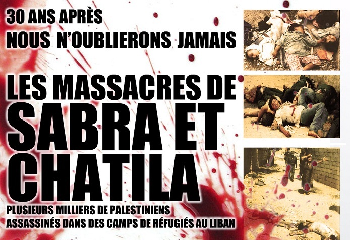 Du 16 au 17 septembre 1982, plus de 3.000 réfugiés palestiniens et civils libanais ont été massacrés dans les camps de Sabra et Chatila, dans la banlieue de Beyrouth, au Liban envahi par l’armée israélienne. Des hommes, des femmes et des enfants ont été méthodiquement égorgés, empalés, éviscérés, violés par les milices chrétiennes phalangistes avec la complicité de l’armée israélienne sous commandement d’Ariel Sharon.