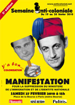 Sachons que va se dérouler la 5e Semaine anti-coloniale du 19 au 28 février 2010 qui comportera, entre autres initiatives, une manifestation le samedi 27 février prochain, de la place de la Bourse au Ministère de l’immigration et de l’identité nationale dont la suppression sera demandée par les manifestants. A l’ordre du jour également, la reconnaissance des crimes coloniaux commis par la France et leur condamnation.