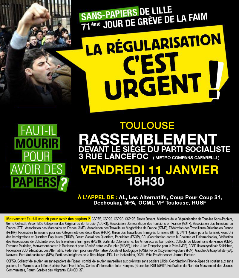 Vendredi 11 janvier sera le 71ème jour de grève de la faim des sans-papiers de Lille. Les choses sont désormais dramatiquement simples : des vies sont en jeu. Or le gouvernement continue de jouer l’épreuve de force contre ces femmes et ces hommes dont le seul crime est d’exiger d’être traitéEs dignement. Il joue le pourrissement de la grève en refusant toute ouverture au risque d’un drame qui peut arriver à n’importe quel moment. Cette situation est indigne et humiliante. Elle doit cesser.
