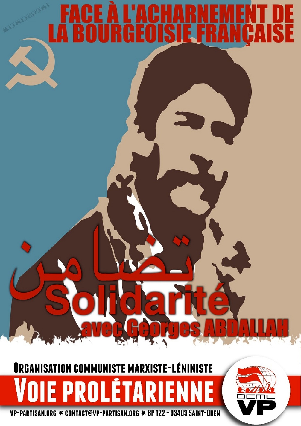 L’OCML-Voie Prolétarienne salue la détermination de Georges Abdallah qui refuse de renier son identité, celle d’un combattant communiste, face à l’acharnement de la bourgeoisie française. Le maintien en détention de ce résistant révolutionnaire est de la seule responsabilité de la bourgeoisie française qui refuse de le libérer car il représente un danger : celui d’un combattant implacable de la lutte des peuples dans le monde et contre l’impérialisme.