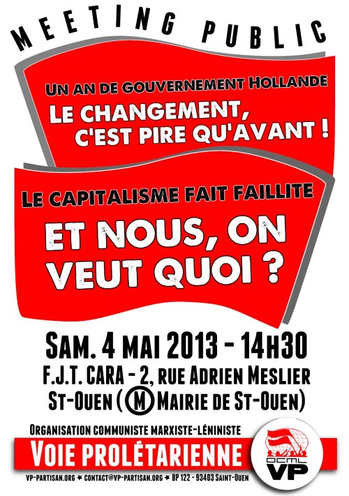 L’OCML Voie Prolétarienne de Région Parisienne vous invite à un meeting public :